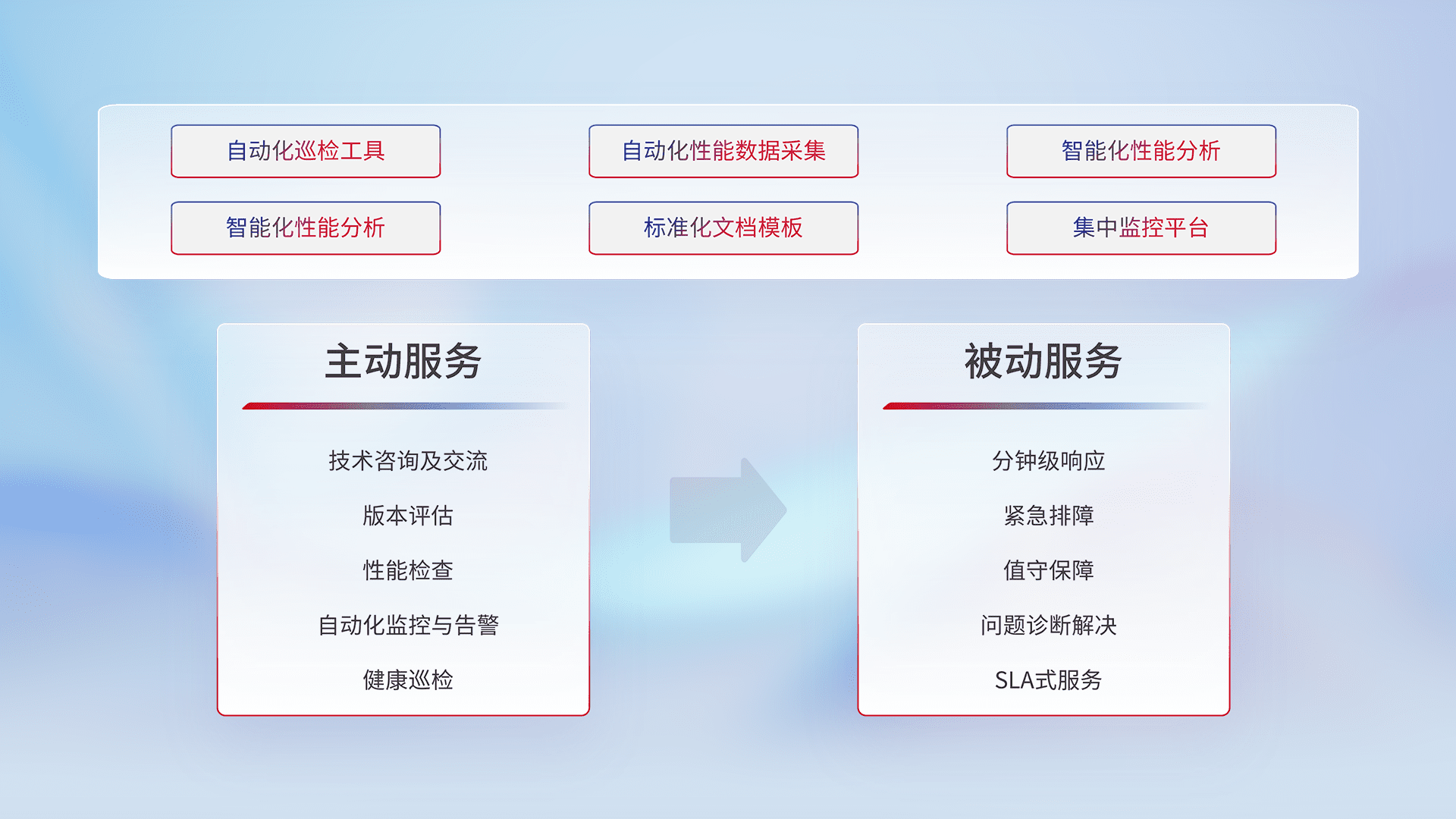 智能化工具和标准化文档,,,,保障服务质量,,提供主动服务(包含技术咨询、、版本评估、、、、性能检查、、、自动化监控与告警、、、、健康巡检)和被动服务包含(分钟级响应、、紧急排障、、、值守保障、、问题诊断解决、、SLA服务)。。。