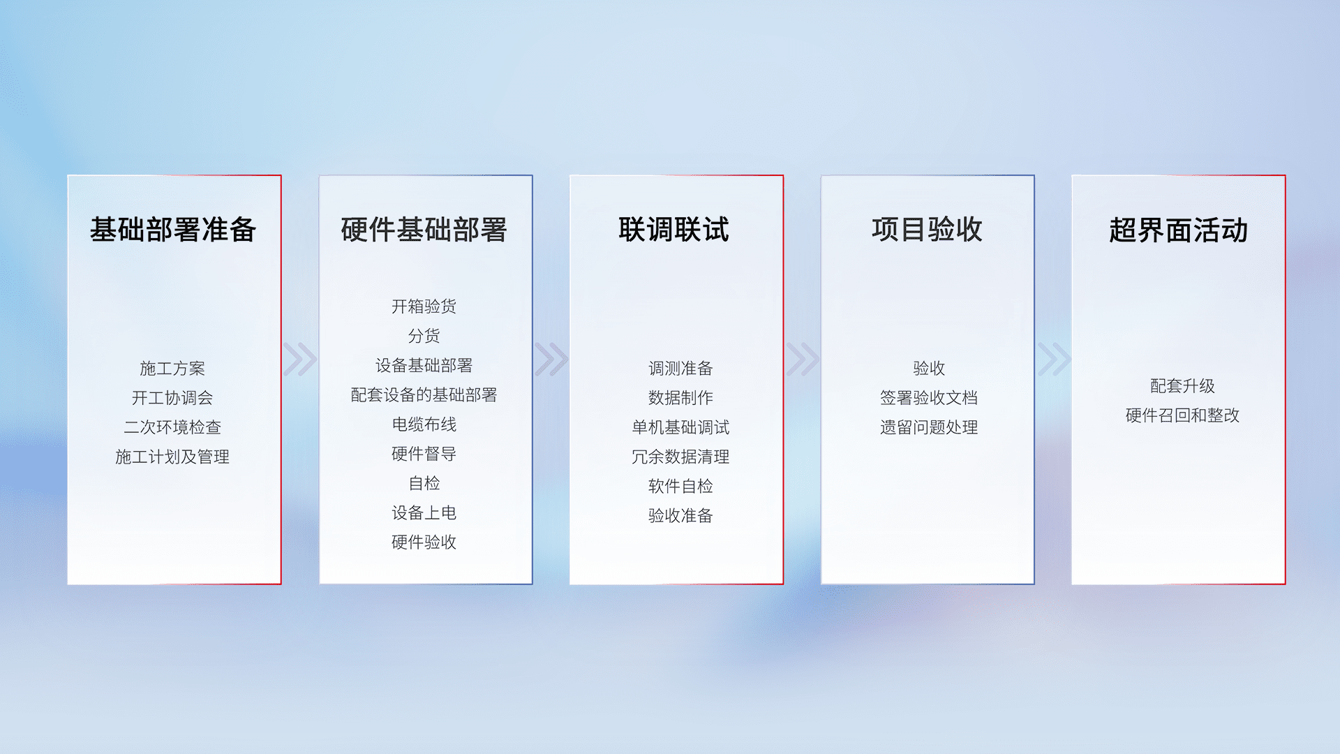 从基础部署准备、、硬件基础部署、、、、联调联试、、、、项目验收、、、、越界面活动的全过程可追溯,,保证施工质量和进度。。